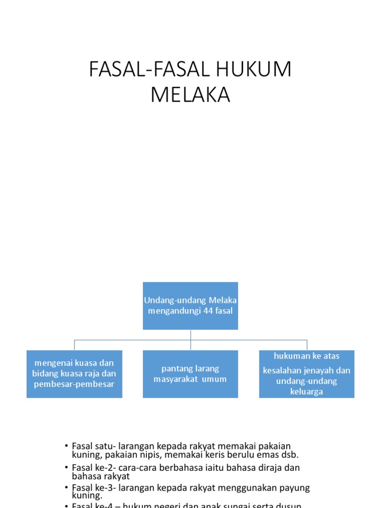 L-_-_ Jenayah 2 Perbuatan jenayah menggugat Setiap pembesar Melaka rnempunyai peranan dalam ketenteraman dan. - Terdapat dua undang-undang bertulis 成文法律 pada zaman Kesultanan Melayu Melaka 马六甲马来苏丹王国 iaitu Hukum Kanun Melaka 马六甲法典 dan Undang-Undang Laut Melaka 马六甲海事法典. Keadaan ini membuktikan bahawa kehidupan bernegara dan ciri sistem berperlembagaan terserlah pada zaman Kesultanan Melayu Melaka.